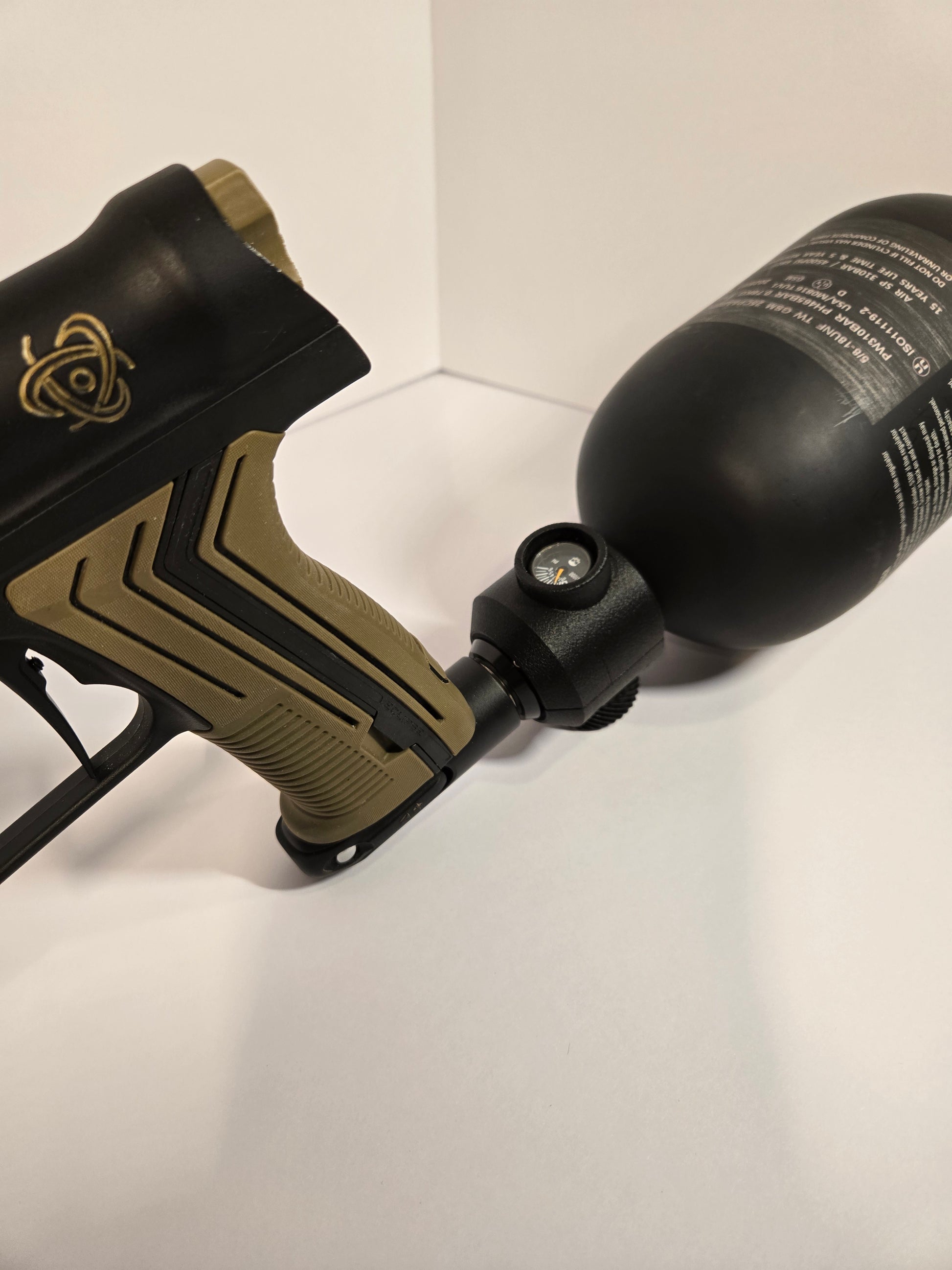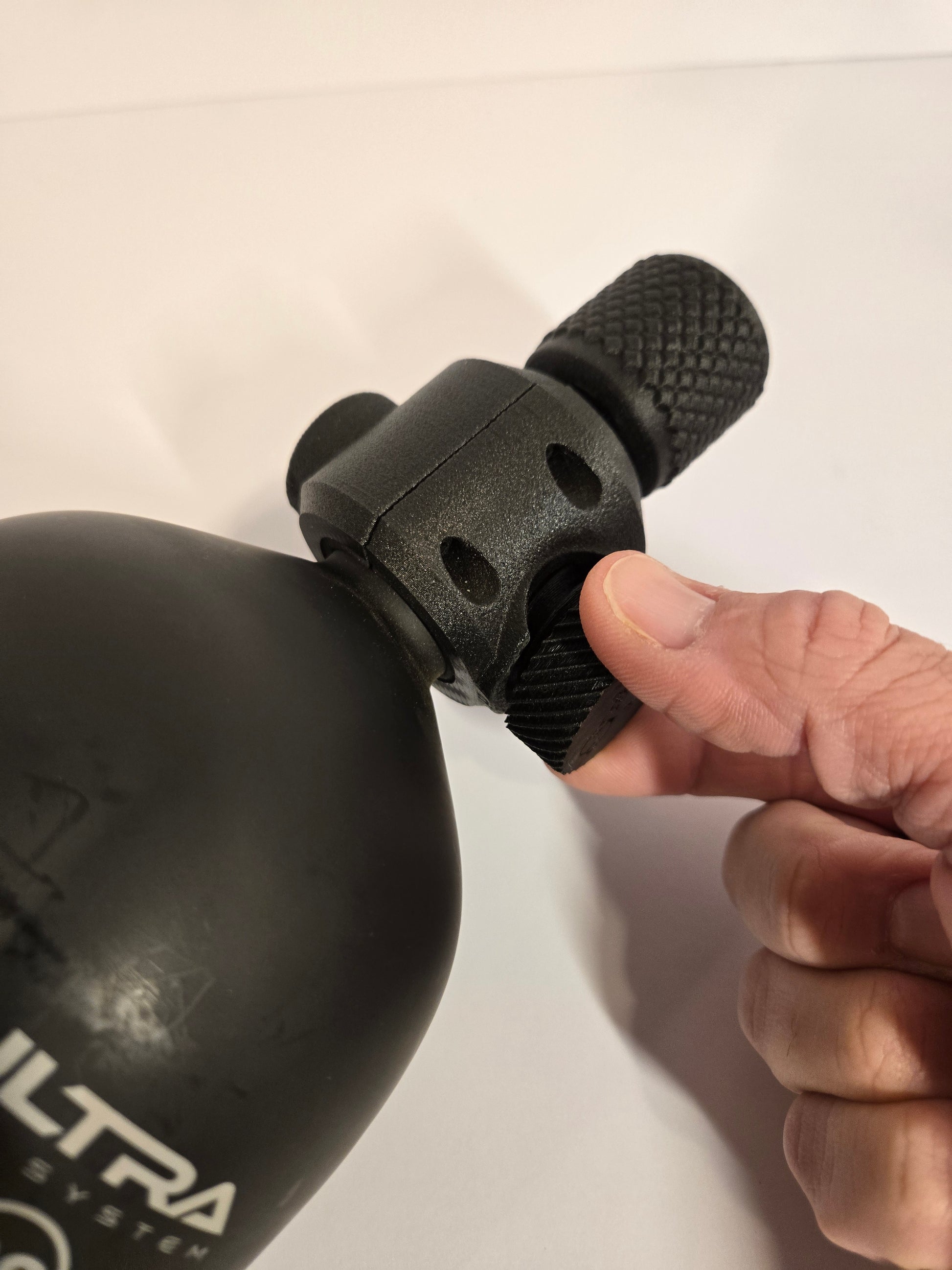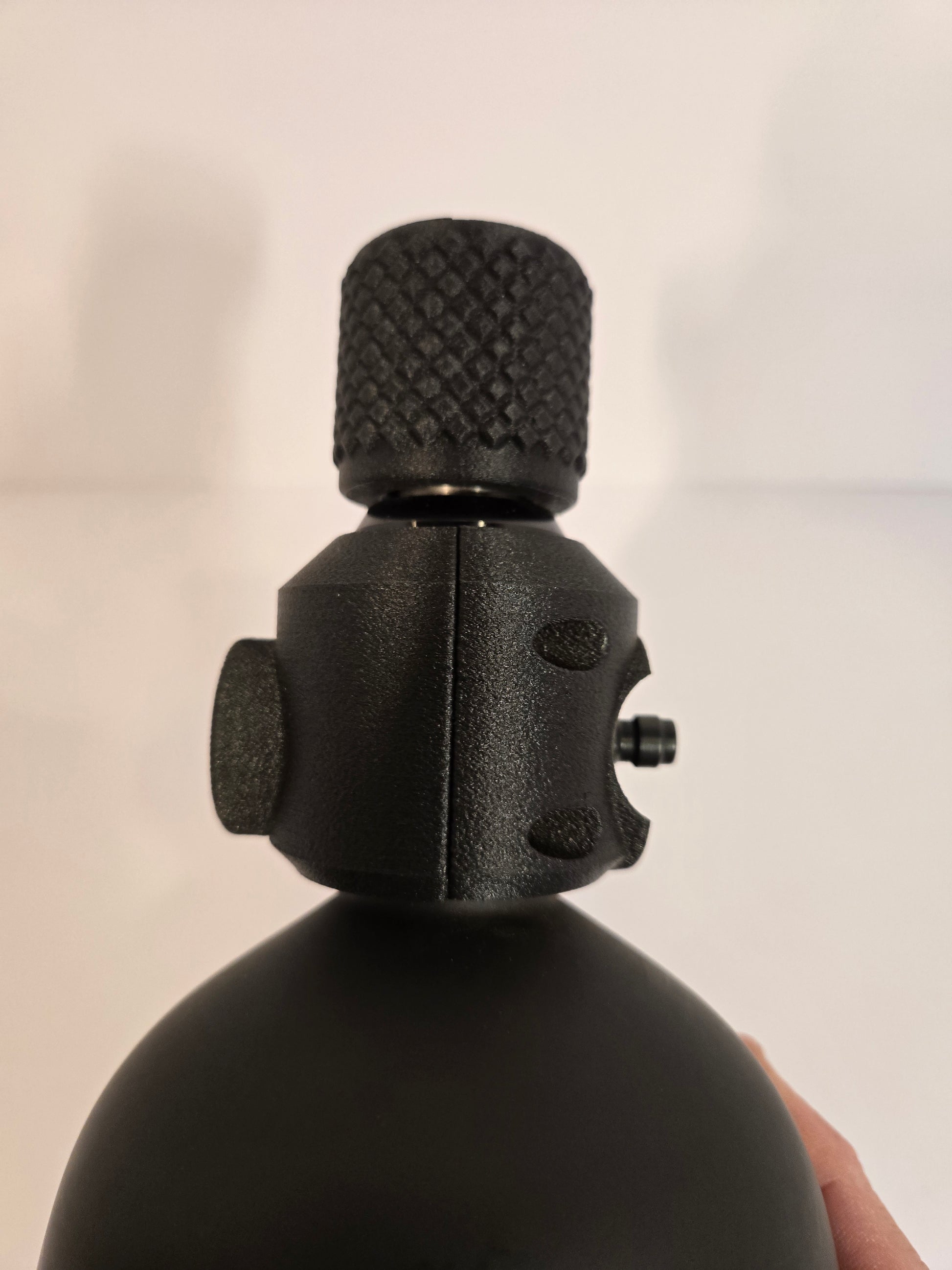Introducing the REGuard. The first ever answer for complete protection for your tank regulator both on and off the field! Tired of banging your expensive regulator on hard ground and rocks just for your guage/ fill nipple to crack or break off? Are you wasting time and hours between points rebuilding your regs because of trash making its way into your reg and marker? Is mud and filth caking up your reg on rainy days? The REGuard is the remedy! The REGguard is made of strong NPC (Nano Particle Composite) and is designed to be streamlined to your marker that WILL NOT hinder your handling or marker discipline during a game. Internally there is a layer of 3M Neoprene on the inside that seals out moisture/ trash and allows the Regulator to free float on the inside for impacts and shock. The rapid thread fill cap allows for quick access to your fill nipple with deep notches on the side allow for gloved hands to easily disconnect the fill connect collar. The Guage is recessed and prevents side impacts. The REGuard comes with a thread protector for transport when off the field. It also doubles as a degasser when screwed down all the way allowing air to pass through the vent holes on top. The REGuard comes in 2 different forms to fit your particular regulator. MOD1 ( All Ninja Regs, HK HP8, All ELEV8 Regs, and many like regs that are slimmer), MOD2 ( Powerhouse Counterpunch standard, HK Aerolite2, and many more larger diameter regs).